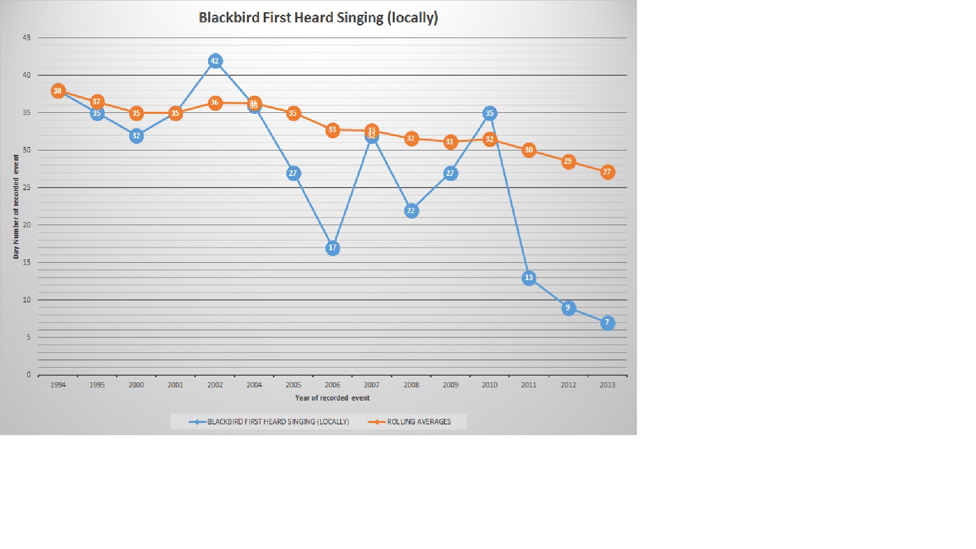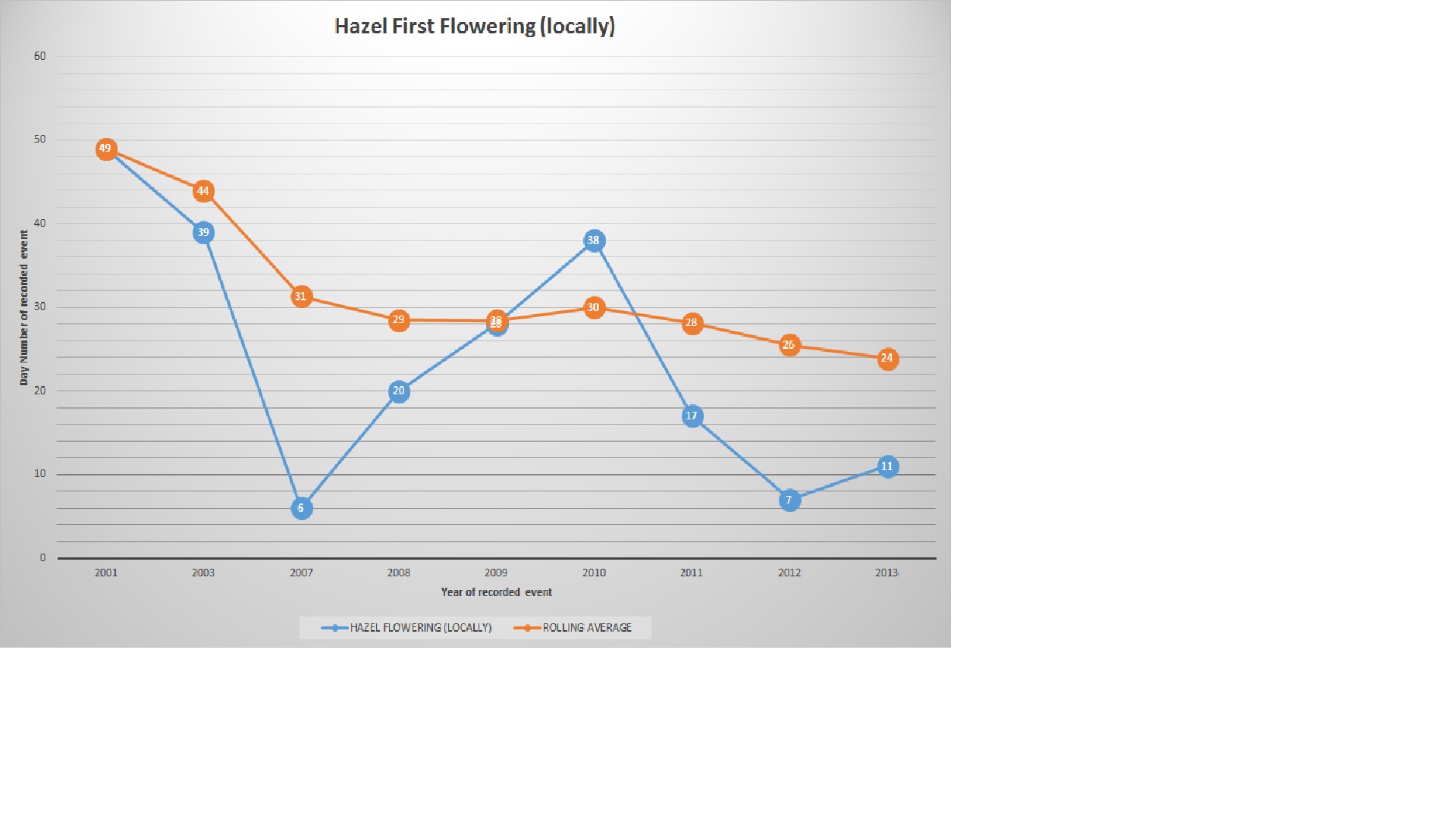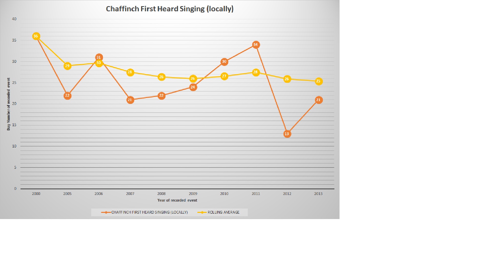 Represented below are the aforementioned sightings in such a manner. Please note each event recorded annually is represented as a day number and not in date format. The events have been logged, only during years, in which I managed to achieve a meaningful result. Please make what you will of the data.
