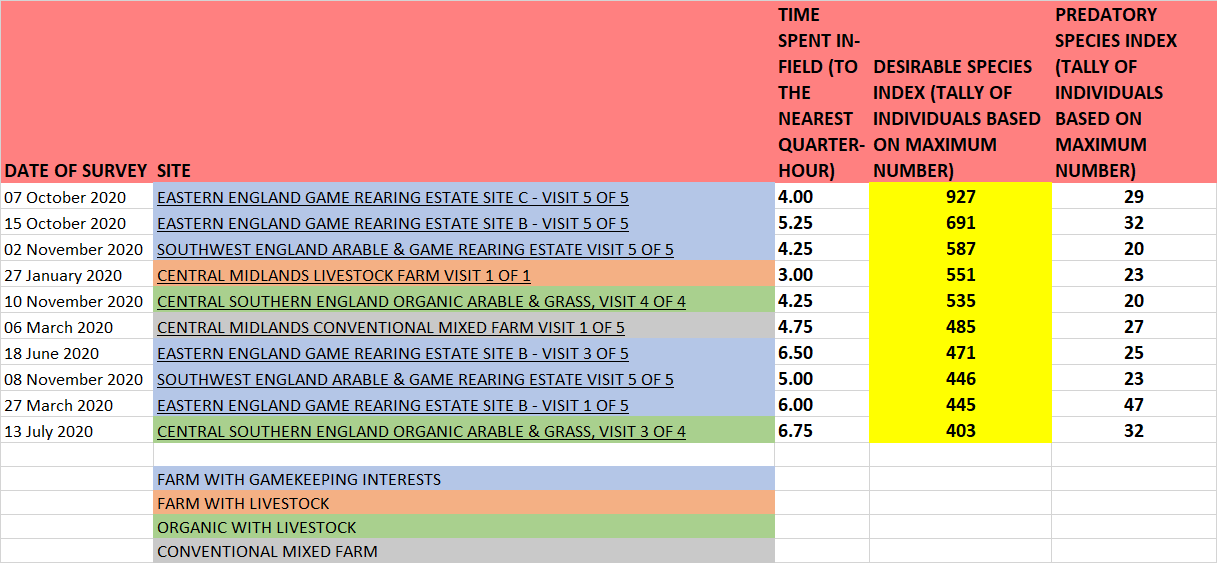 2020 may have derailed some but to be brutally honest; I’m still firmly on that path to delivering on my many ambitions of making my presence count for something. I’m sure many of you get that in this weird year that is 2020. I am still focussed on my continual improvement processes, striving daily to be better informed on all I’m witnessing when out in those farmer’s fields. This is now my full time working role; there are no other side gigs (to coin a phrase often used in America). So let’s keep this short. Embedded in this post is a Facebook posting from today. Hopefully included also as an attachment is the same snapshot of my paying client’s private bird data which highlights the Top Ten Species-Rich sites surveyed during 2020.